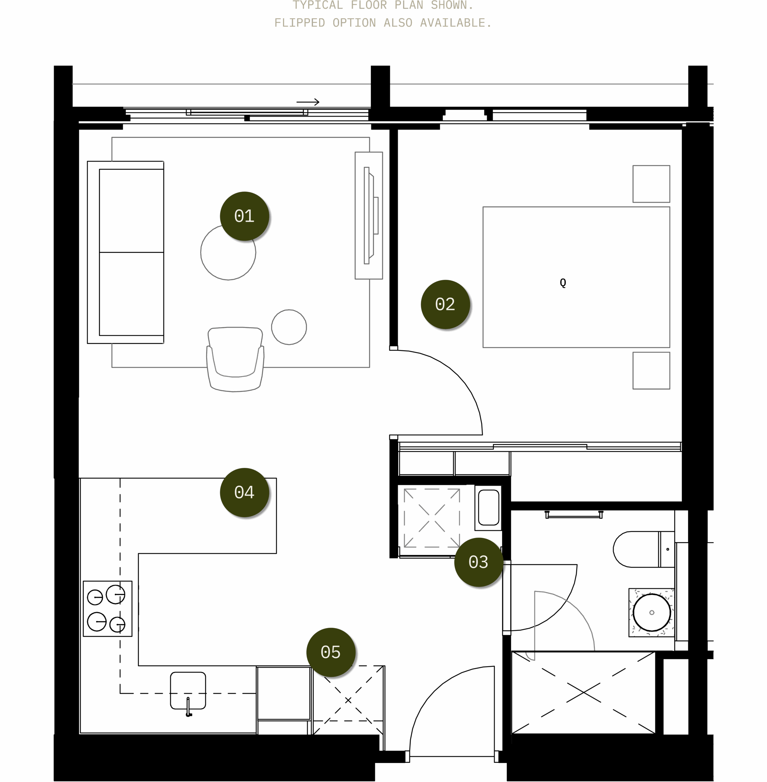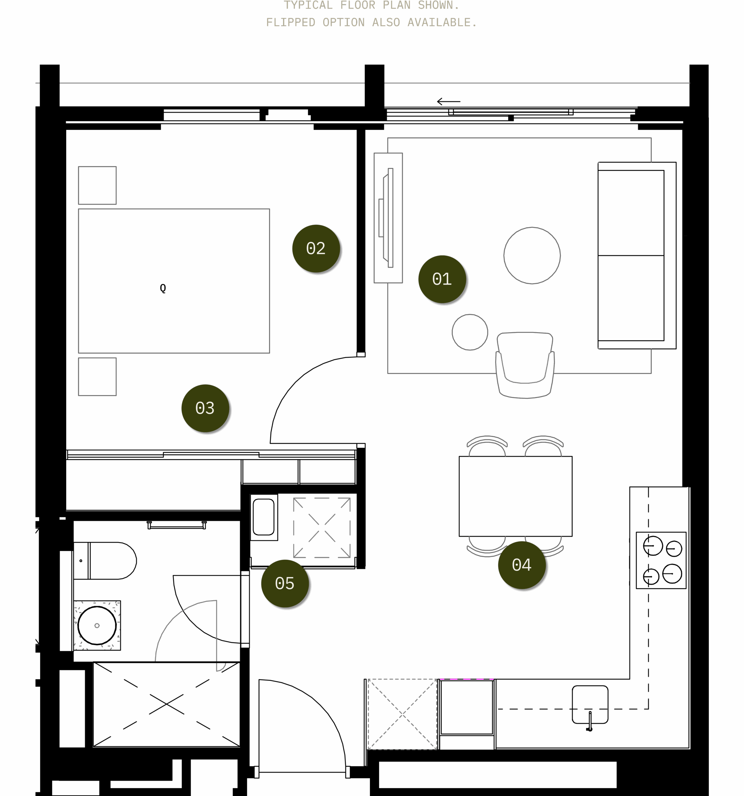 Designed to offer a more open and customisable space, Apartment Type B5 offers an open plan style layout. The open kitchen and dining area flow into a living area, which is flanked by the master. The bedroom itself is packed with inbuilt storage.